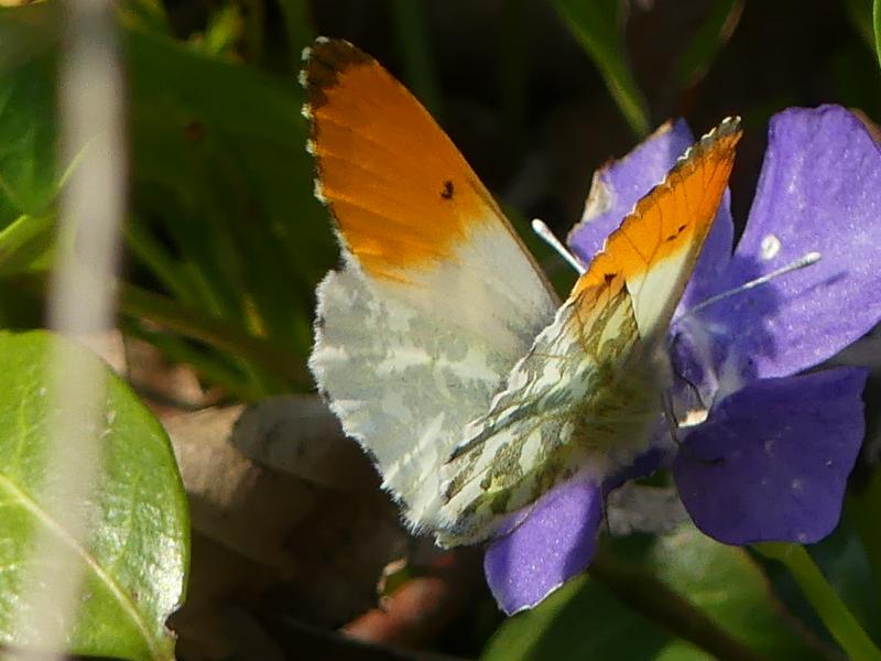 Am Wochenende waren zwei männliche Aurorafalter unterwegs, einen habe ich schließlich mit dem Fotoapparat erwischen können.