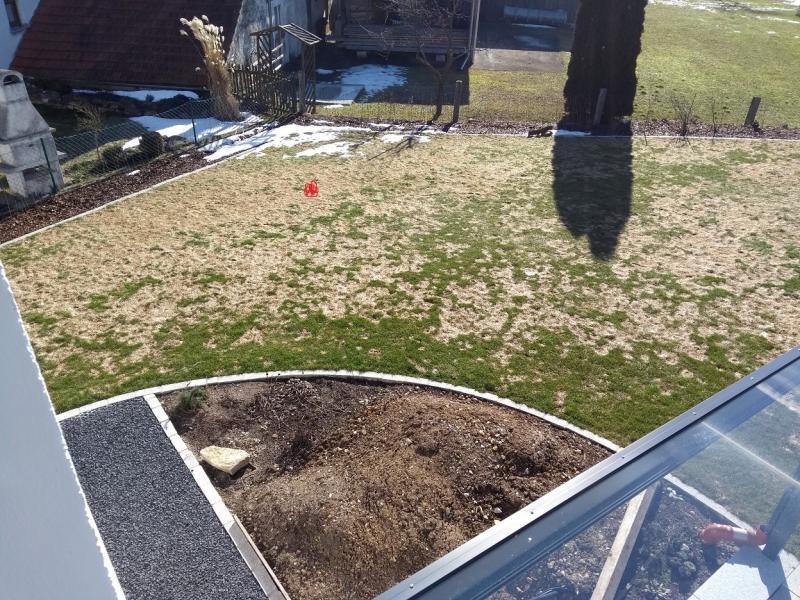 Man sieht die Terrasse unten recht im Bild, diese ist nach Süden ausgerichtet, die Grenze oben links im Bild ist ziemlich genau Osten.