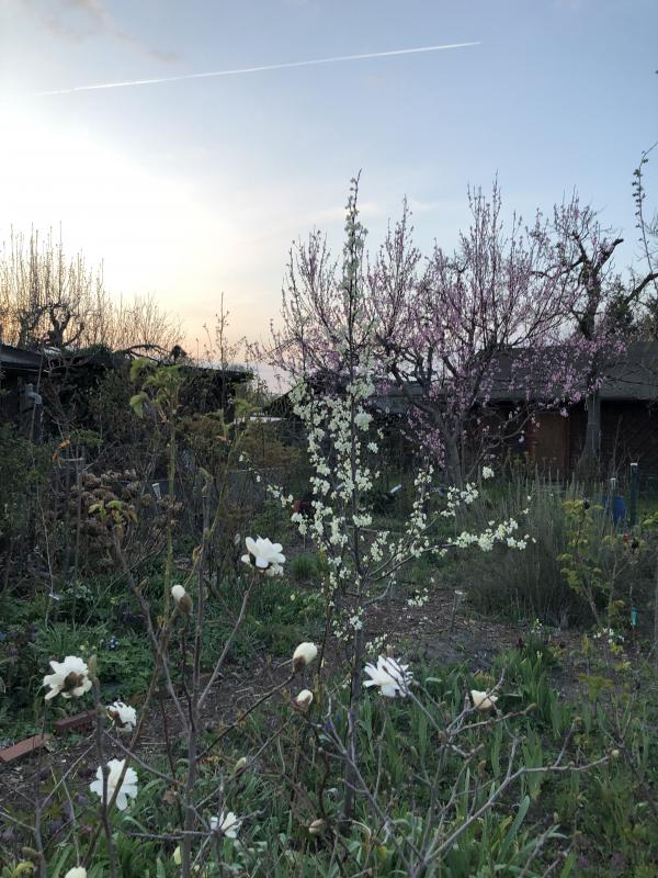 Am Freitag ging hier die erste Spillingsblüte auf, heute steht alles in Vollblüte, der ganze Garten, mindestens 15 Stück, die Pfirsiche und Prunus brigantina, die Gehörnten Mauerbienen, dicke puschlige Mädels, sind im Flow 8) 8).