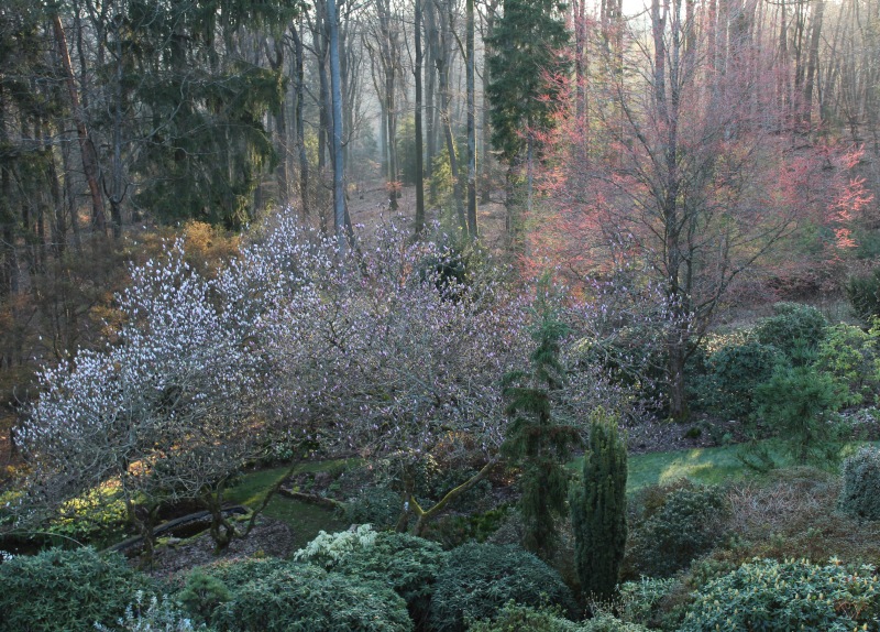 Auf der Nordseite blüht Clematis armandii im Topf, lässt sich vor der weißen Wand nur sehr schlecht fotografieren...