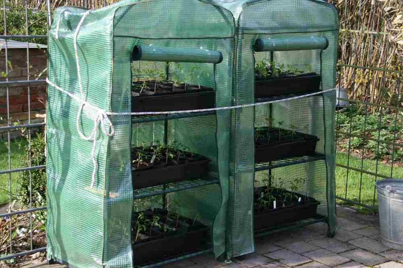 Ich verwende am liebsten die viereckigen Plastiktöpfe, die kann man schöner einsortieren bzw. es gehen mehr rein in die Fächer.Die hebe ich mir immer auf. Zuerst kommen sie in dieses Häuschen zum an draußen gewöhnen.