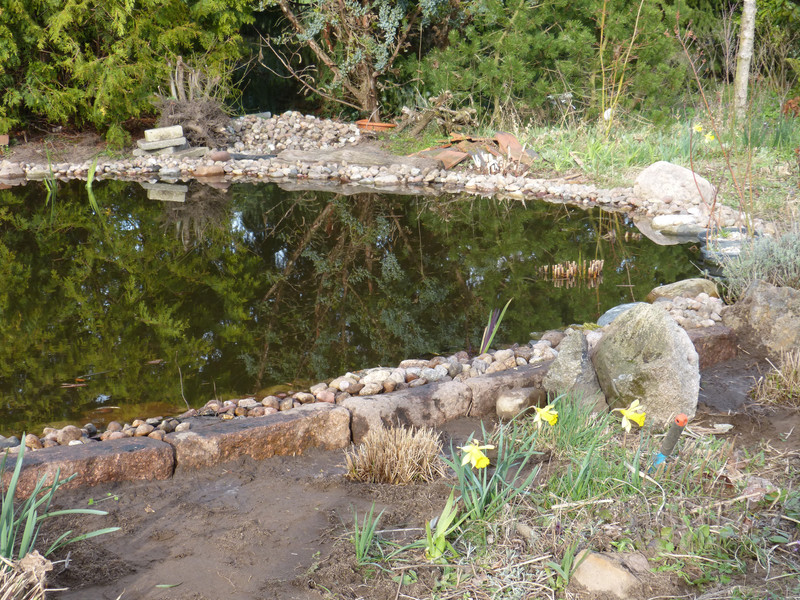 Das letzte Jahr hat weder Zeit noch Lust gelassen, die Sache endlich anzugehen, dafür ging es nun recht fix. Gestern schnitt ich die Folie auf Höhe und begann damit, den Rand mit Kieseln zu kaschieren. An der Vorderseite, wo der Höhenunterschied im Gelände sich sehr deutlich bemerkbar macht, habe ich einige Borde gesetzt. Offen ist nun nur noch der Steg, für den ich erst noch ein Auflager im Teich platzieren muss. Das wird nun aber auch in Bälde passieren.