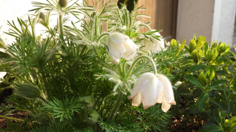 Im Beet ist die Küchenschelle rückwärts gewachsen, am Fuss eines Buchsstämmchens im Kübel fühlt sie sich schon ein paar Jahre wohl.
