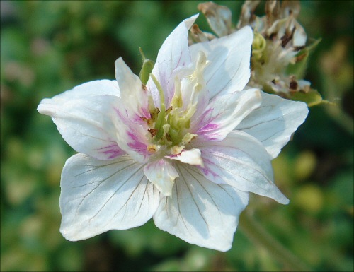 Ich habe ein nicht sehr gutes Bild von Blüten dieses Storchschnabels, #220, sind klein, ca. 1,5cm, weiß, mit blasslila Aderung, die nicht bis zum Blütenrand rauf geht, blaue Staubgefäße.