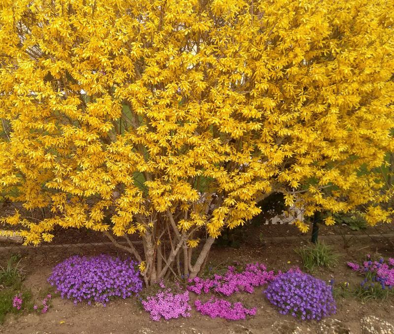 Meine Handycam kann die Farben nicht richtig, aber Forsythie mit verschiedenen Blaukissen unterpflanzt kann man sich ja vorstellen. (oder lieber doch nicht?) ;)