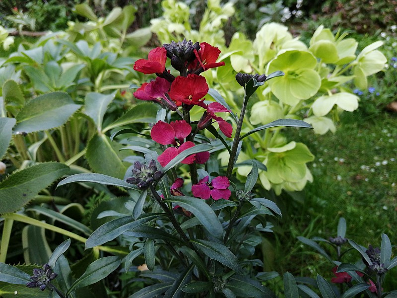 Überwintertes Erysimum cheiri vor einem mittlerweile beeindruckenden Exemplar von Helleborus argutifolius, den ich mal vom agarökonom bekam.