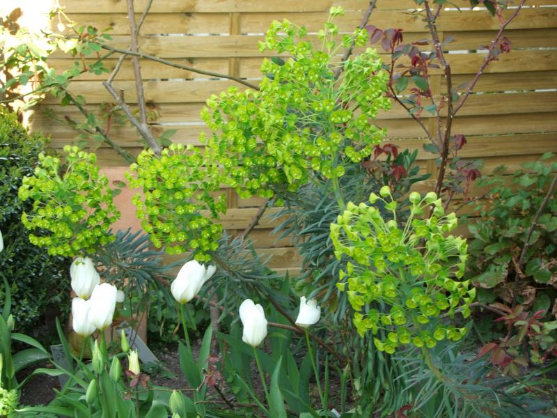 Eigentlich eine Huddelecke,aber die Euphorbia blüht nach einem milden Winter üppig.