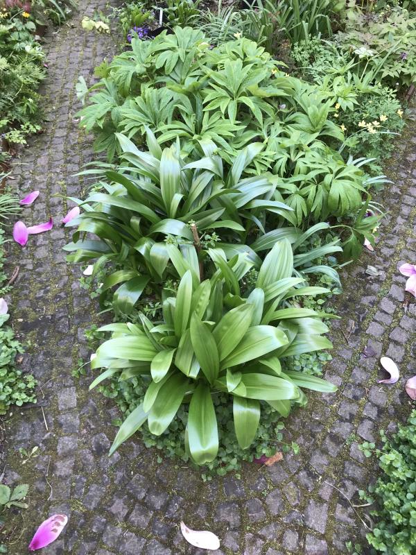 Es handelt sich um ein verschobenes Dreieck vorm Haus,rechts und links von hohen Hecken begrenzt(rechts hinter hecke Straße,links hinter Weißdornhecke tiefe Bahnböschung) mit zwei Süßkirschen,einigen Immergrünen Gehölzen und in der Mitte eine Hängebirke.Im Frühjahr funktionieren die Zwiebelblüher gut,weil dann die Bodenfeuchte noch ausreicht.Es ist ein extrem armer Lehm, der im Sommer wie Beton ist.Enormer Wurzeldruck ist auch vorhanden.Ich habe die ersten 10 Jahre immer viel Kuhdung untergegraben,aber jetzt aufgegeben.Im Hochsommer ist es dann eben fast nur grün,trocken und partiell recht schattig.