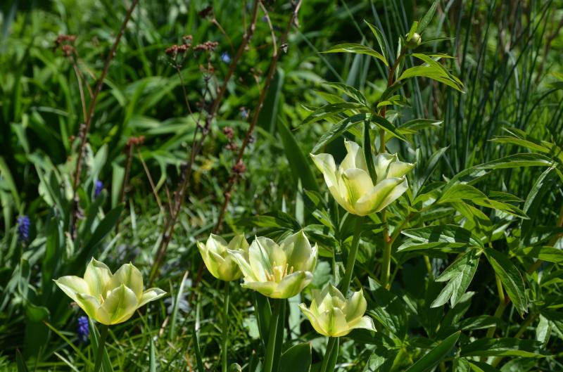 Hinten unterm Trompetenbaum habe ich eine weiß-pink geflammte einzelne Tulpe. Das ist definitiv ein Sämling von Purissima und Don Quichotte. Leider ist das Foto unscharf geworden.