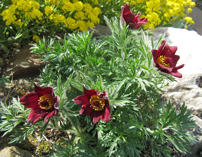 Hast Du dort auch Pulsatillen gesetzt? Wir hatten die Sorte P. turkzaninowii, mit etwas gefransten Blütenblättern. Bringt Farbe ins Beet.