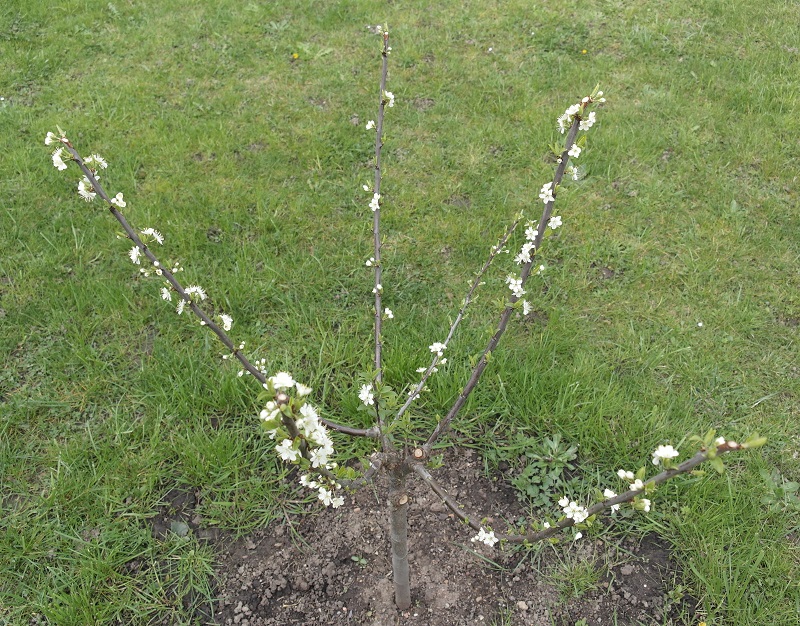 Anbei mal ein aktuelles Foto meiner Mirabelle von Metz, welche ich letzten Herbst gepflanzt habe. Den Baum hab ich in Lothringen als Gobelt-Baum gekauft. Im Februar hab ich meine Mirabelle geschnitten. Von den 9 Leitästen blieben 5 erhalten, welche ich um 1/3 eingekürzt habe und 2 schwache Äste, die später weg kommen - die hab ich nur gelassen, um ein paar Früchte zu ernten. Blüten gibt's schon reichlich, ich hoffe, dass auch etwas ausreift :) Mal schauen, wie sich der Baum im Laufe des Jahres entwickelt.