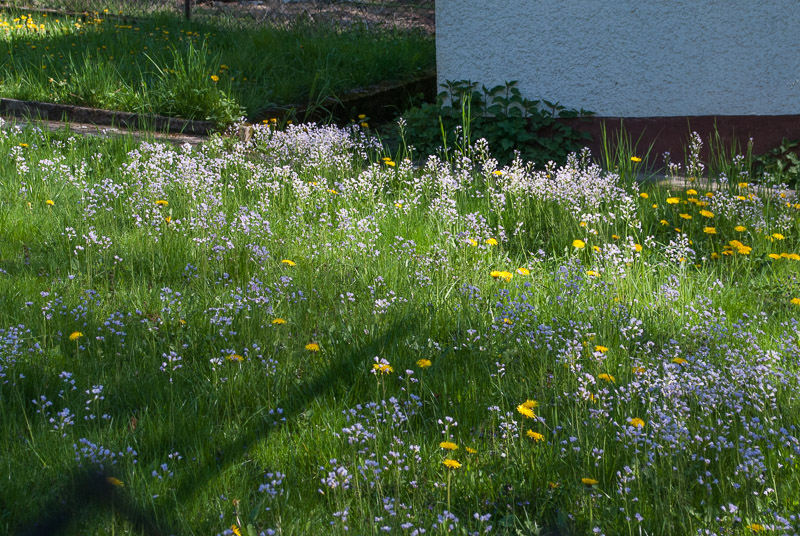 Das Wiesenschaumkraut blüht gerade prächtig bei meinem Nachbarn, der mit dem Garten zum Glück nicht so viel am Hut hat und dementsprechend auch nicht jede Woche mit dem Rasenmäher unterwegs ist. Bei mit gibt es auch vereinzelte Pflanzen, aber ich befürchte, dass es um meine Tanne herum etwas zu trocken ist.