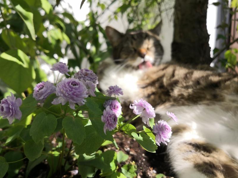 Letztes Jahr haben wir die potthässliche, mit vielen braunen Trieben durchsetzte Thujenhecke am Haus, hinter der nichts wuchs, rausgerissen und die Fläche mit Epimedium x warleyense 'Orangeblüte' bepflanzt. Dazu eine Reihe Choisya 'Aztec Pearl', die braucht noch ein wenig (hier nicht mit drauf), und eine Melange von Narzissen.