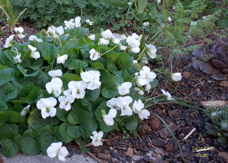 Viola cornuta Bowles Black Strain versamt sich reichlich. Unzählige kleine Sämlinge in allen großen Tontöpfen,am Hang und vor der Hecke.