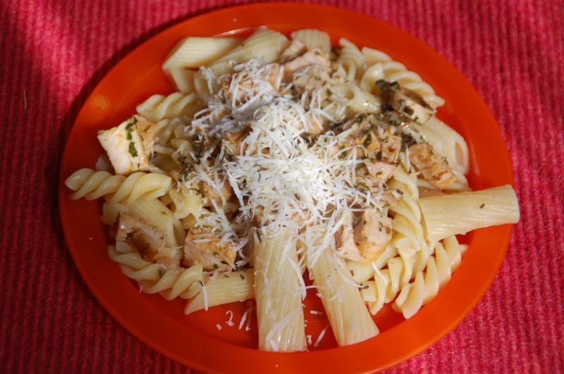 Nudeln mit gegrillter Pute in Kräuterbutter, dazu Schafskäse mit Rosmarin und Thymian
