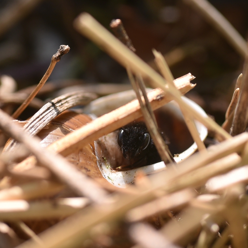 Ja, das finde ich auch. Sie hat auch etwa dieselbe Größe. Aber O. cornuta fliegt nie im Suchflug über dem Boden, daran kann man die Schneckenhausbiene vermutlich erkennen. Was man übrigens fast noch eher bemerkt als die Weibchen, sind die Männchen. Sie haben dasselbe Verhalten wie die anderen Osmias, nämlich alle ihnen bekannten Nistorte abzuklappern. Nur sind es hier die Schneckenhäuser! ;) Sie sehen total anders aus als die Weibchen (kein oranger Pelz), aber sie schwirren ständig im Kreis über allen Schneckenhäusern, an denen sie ein Weibchen abzupassen hoffen, und schlüpfen dort auch rein auf der Suche.