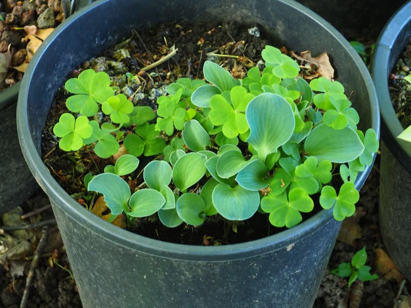 natürlich versamt sich einiges am Kompostplatz. Aquilegia vulgaris in dem Kübel mit Quercus pubescens Sämlingen von Paw paw.
