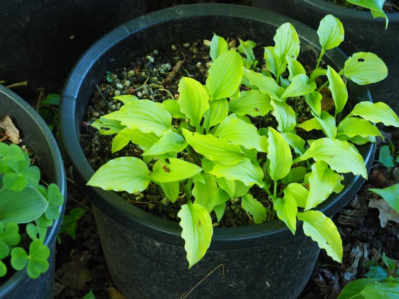 außerdem stehen noch Kübel mit 5 Hostas, die ich behalten hatte. Blue Mouse Ears mit Sauerklee.