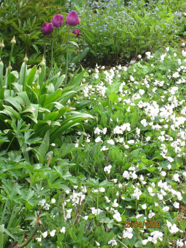 Viola cornuta Bowles Black Strain versamt sich reichlich. Unzählige kleine Sämlinge in allen großen Tontöpfen,am Hang und vor der Hecke.