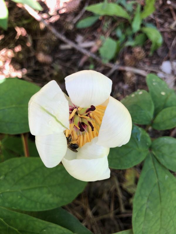 Päonie 'Schildwech' - vielleicht kennt die wer? Dem Bienchen war es wurscht.