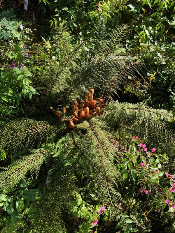 ebenso Polystichum squarrosum - die Wedel glänzen noch mehr als P. polyblepharum - sonnenscheinbedingt kommt es hier nicht so rüber