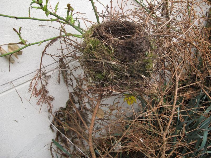 Als ich letzte Woche eine Kletterrose freilegte, also von Fichtenästen bzw. dem, was davon noch übrig war, und der davor stehenden Schilfabdeckung befreite, staunte ich nicht schlecht: In etwa 1 m Höhe war ein großes, überaus kunstvolles, leeres Vogelnest plaziert. Ich konnte es natürlich nicht dort lassen, schon weil es ohne den Schutz von außen bald heruntergefallen wäre, und stellte es auf den Boden unter einen Tisch. Fragte den Nachbarn, was für ein Vogel denn da gebrütet oder zu brüten vorgehabt hätte, der meinte, Wacholderdrosseln, und die seien schon ausgeflogen. Aha, also die, die im großen Ahorn neben dem Gemüsegarten wohnen und Ribisl, Himbeeren und Edelvogelbeeren ratzeputz erledigen.