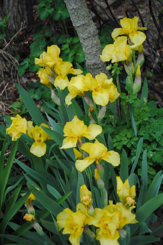die jap. lärche ist schon tot, die zeder lebt noch, die wisteria vor 40 jahren gesät, im 8.jahr blühte sie, im vorjahr habe ich 2 fast schwarze irisse dazugepflanzt, das passt gut farblich und der platz auch, weil trocken