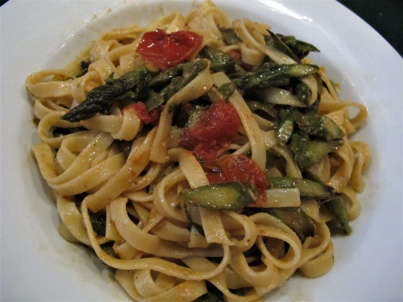 Hier gab es Tagliatelle mit grünem Bratspargel, ebenfalls angebräunten und ganz kurz gedünsteten Tomaten, Parmesan, Basilikum und frischer Butter zuletzt.