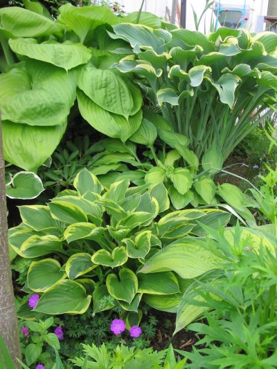 Hallo Swetlana,ich kann Dir im nächsten Frühjahr einen Teil einer gigantischen Hosta abstechen, die Blätter sind ca. 60 cm lang und 40 cm breit, frischgrün mit deutlichen Nerven. Im Hostabuch von Sandra Bond steht sie als "Sum and Substance" beschrieben, möglich ist aber auch "August Moon". Auf dem Foto oben links in der Ecke zu sehen.Auch die Hosta daneben würde ein Teilen vertragen, kenne den Namen aber leider nicht. Ich könnte im Gegenzug eine robuste Staude gebrauchen, die am Zaun ein Loch stopft, allerdings max. 50 cm hoch, da sie sonst in die Kletterrose "Constance Spry" wächst.Sommerliche Grüße,