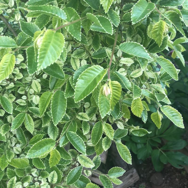 Ulmus parvifolia. Wenn die Blattränder weiß sind, was ich nicht so recht erkennen kann, handelt es sich wahrscheinlich um die Sorte 'Frosty'.