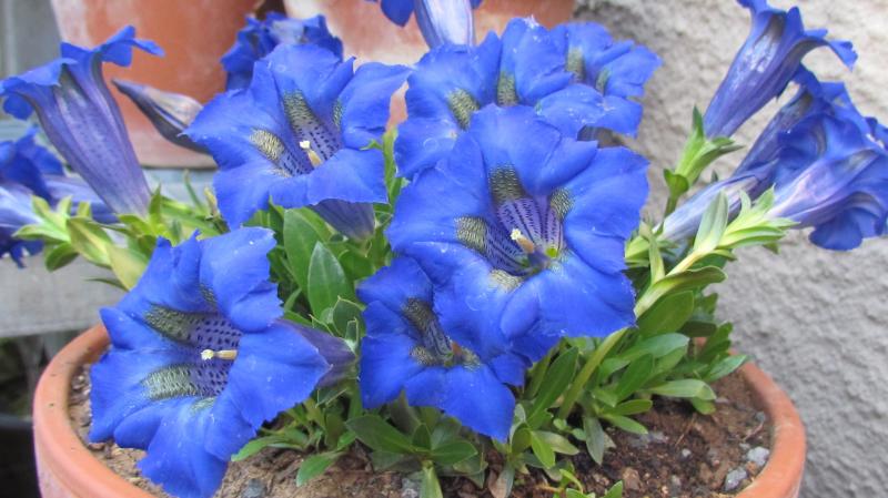 Da sich das mit den Ritterspornen hier erledigt hat und ich aber auf das Enzianblau nicht völlig verzichten wollte, habe ich mir letztes Jahr ein kleines Sortiment ebendieser für meinen Topfgarten geholt. Nur die unkompliziertesten Arten, trotzdem hat es mich bei Gentiana verna var. angulosa sehr erfreut, dass er nicht nur den letzten Sommer mit dem ständig kurz vor dem Vertrocknen stehen überlebt hat, sondern tatsächlich auch wieder blüht!