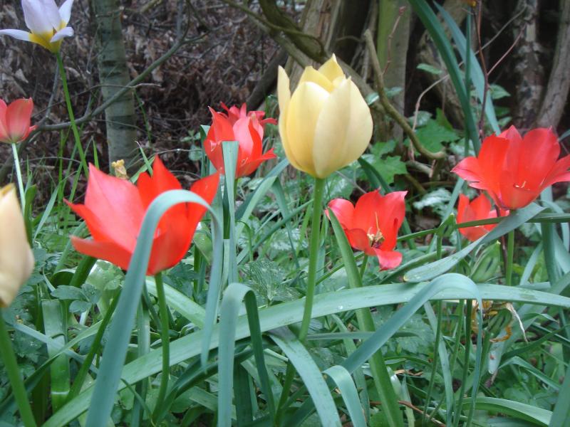 Hier auch, es kommen immer noch ein paar "allerlertzte" Tulpen aus irgendwelchen Untergründen im grünen Dschungel. Bevor Tulipa sprengeri demnächst mit explosivem Rot den Schluss macht.