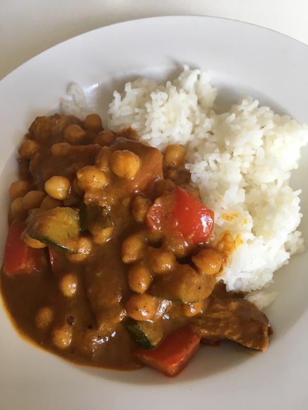 Heute aber endlich wieder ein Bild. Es gab ein indisches Curry mit ganz viel Gewürzen, Wegmussgemüse, Kichererbsen, Pute und Reis.