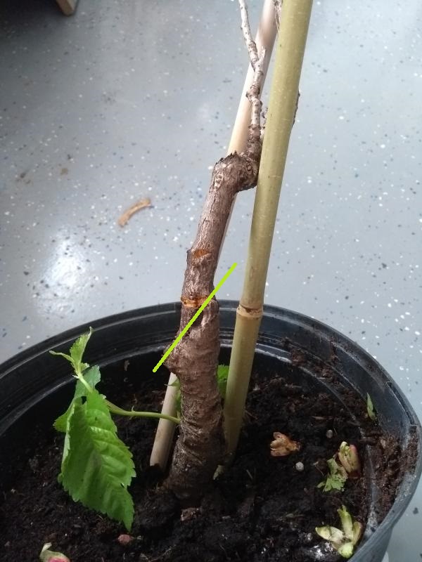 Da denke ich auch. Die Veredelung müsste der Knubbel über diesem Austrieb sein.