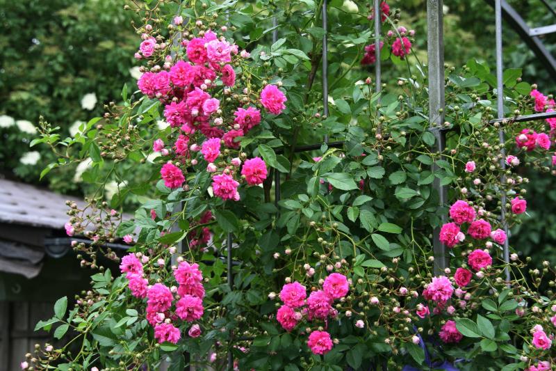 Ich rate allen ab, an einem Bogen zu der Jasmina eine viticella zu pflanzen. Die Clematis wird Euere Rose zuwuchern, da leiden beide. Wenn eine Clematis dann höchstens eine Cl.intigrifolia, die sind nicht so wild und halten sich nur an den Kletterrosen fest. Diese Kombination geht gut. Habe zu meiner Kletterrose Super Dorothy die Cl.int.Durandi gepflanzt. Das paßt gut und keine behindert die andere.
