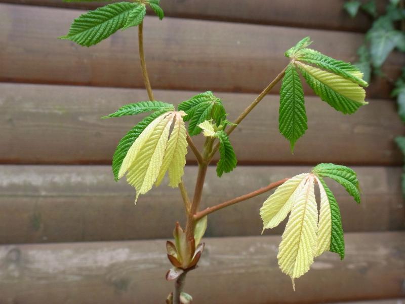 Neulich wollte ich eine Aesculus californica umveredeln, es dann aber doch nicht übers Herz gebracht. Die Blätter sind im Austrieb wie chlorotisch und vergrünen später.