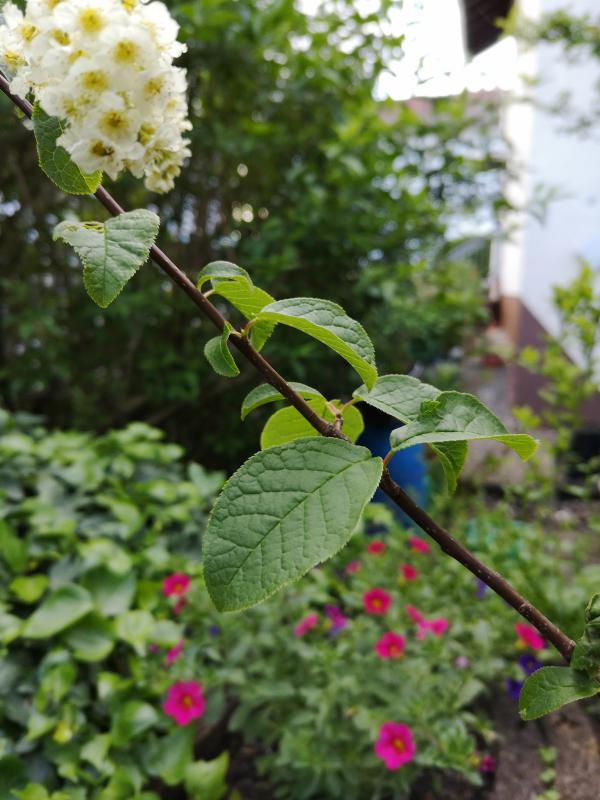 Mein Nachbar hat einen Strauch aus Norwegen mitgebracht, er wächst dort wild, mehrere Meter hoch und breit, Wurzelausläufer, blüht zur Zeit weiß.