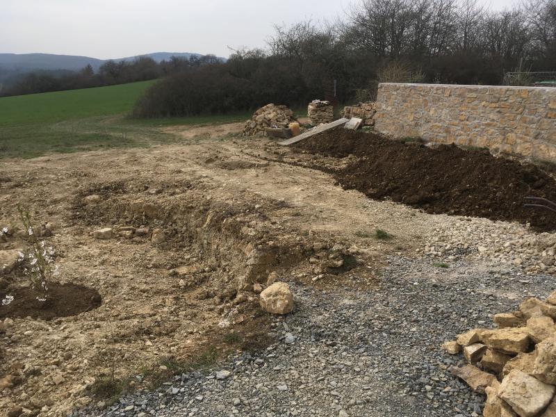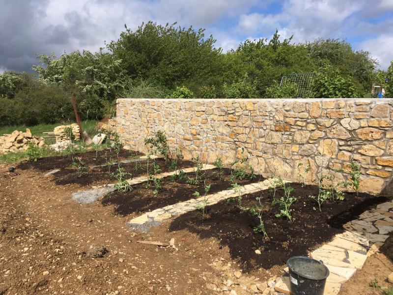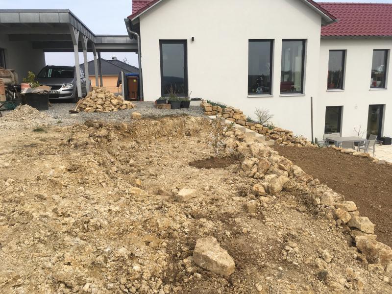 Der Sitzplatz wird noch mit den gleichen solnhofer Platten ausgelegt wie die Terasse. Die begonnenen Wege zwischen den Gemüsebeeten ebenso. Außerdem wird ringsum Rasen gesät, zwischen birkenbeet und Gemüsebeeten werden dann ebenfalls als trittsteine die Platten eingefügt