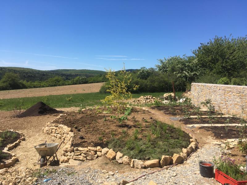 Hier nochmal im jetzigen Überblick, Sitzplatz mit dahinterliegendem birkenbeet und dann Gemüsebeeten.