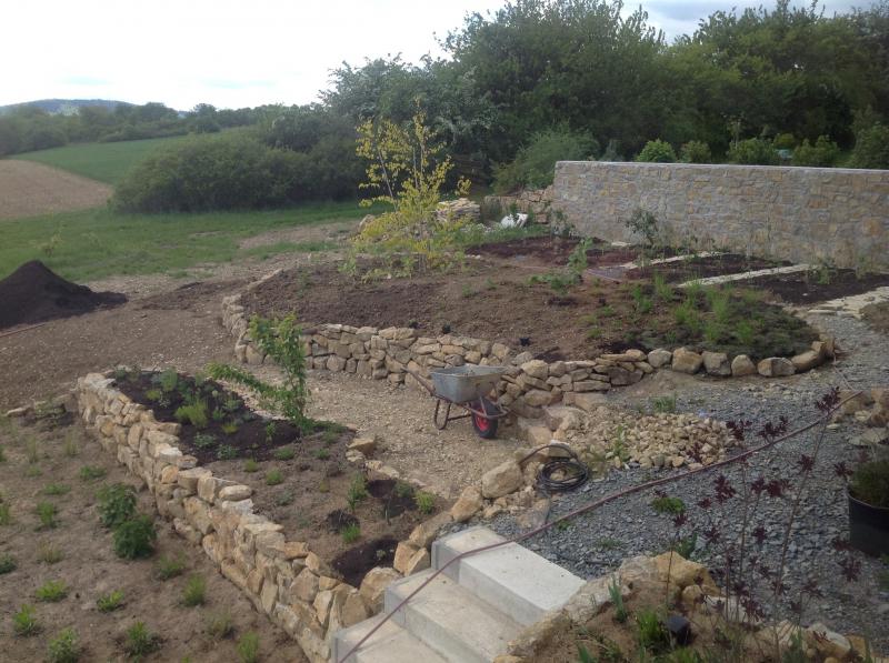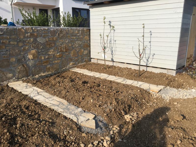 Der Sitzplatz wird noch mit den gleichen solnhofer Platten ausgelegt wie die Terasse. Die begonnenen Wege zwischen den Gemüsebeeten ebenso. Außerdem wird ringsum Rasen gesät, zwischen birkenbeet und Gemüsebeeten werden dann ebenfalls als trittsteine die Platten eingefügt