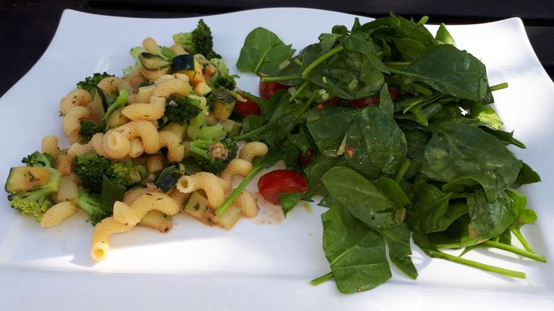 Pasta mit Zucchini, Brokkoli und Zwiebelringen, dazu erster Gartenspinat als Salat mit Tomaten