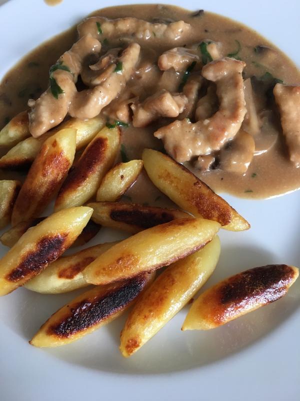 Wir hatten gestern Pilzrahmgeschnetzeltes mit Schupfnudeln und Gurkensalat