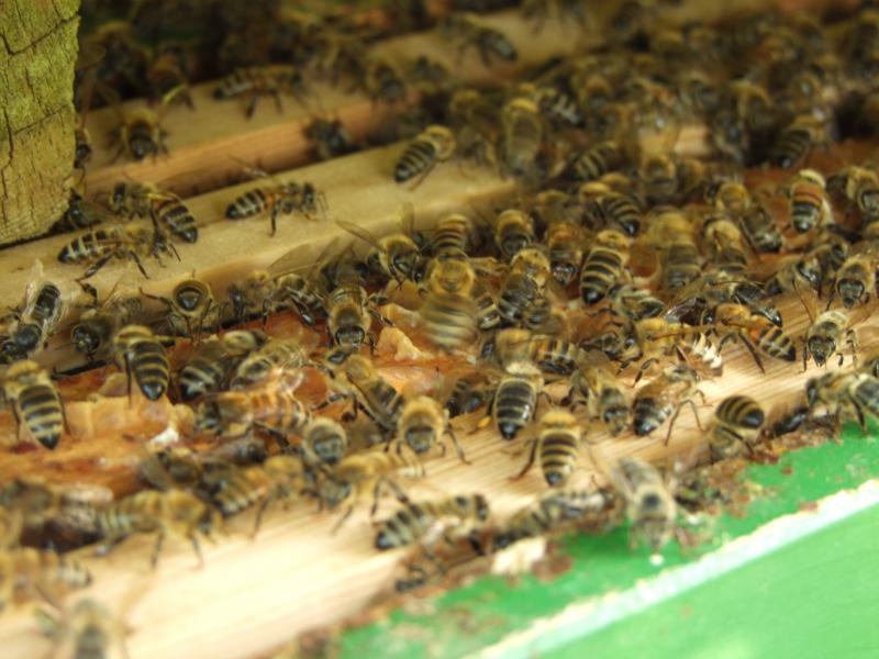 Ein Bienenvolk hatte sich geteilt und war ausgeschwämt und ...genau unten am Fuß von einer sehr stacheligen Rose hatten sie es sich gemütlich machen wollen.Es war nicht rauszukriegen.Ein Kasten mit Futterwaben zum Locken wurde daneben aufgestellt,aber es hat drei Tage gedauert,bis die Bienen einsahen,dass der Kasten die bessere Behausung ist.Der Regen am Freitag war ihnen dann zu unangenehm.