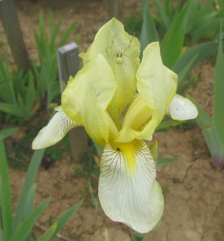 Iris x flavescens "Hedwig", die erste Blüte dieser wohl Hybride, mit Krabbenspinne.