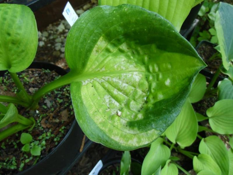 Bei mir haben drei Hostas Sonnenbrand: 'Tropical Storm'. Das ist ein Sport von 'Rainforest Sunrise'. Die zweite Hosta mit Sonnenbrand ist: Überraschung: 'Rainforest Sunrise'! Was gibt es denn noch für Sports von 'Rainforest Sunrise'? Achja, 'Pocketful of Sunrise'. Meine dritte Hosta mit Sonnenbrand ist... Ratet mal, kommt Ihr nie drauf! Ja, genau: 'Pocketful of Sunrise' (siehe Bild). Allerdings standen die Töpfe an drei völlig unterschiedlichen Stellen. Die eine hat nur etwas Morgensonne bekommen, die andere nur Nachmittagssonne, und die dritte an einer Stelle, wo ich Sorgen hatte, ob da überhaupt genug Licht hinkommt, aber alle drei haben Sonnenbrand.