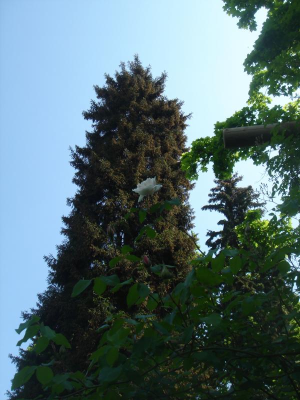 Mme Alfred Carrier, gegen Himmel und Orientfichte