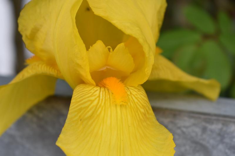 Gelbe Iris stehen vor einer Graham Thomas Rose, die dieses Jahr extrem breit wächst.