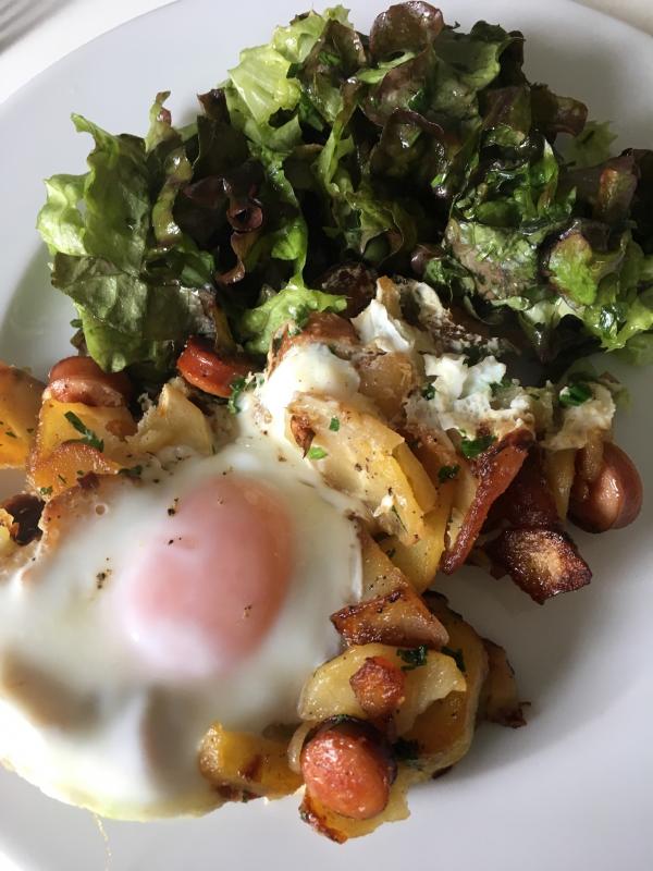Wir hatten heute Kartoffeln, gemischtes Gemüse (Kohlrübe, Karotten, Pastinaken mit etwas Butter gedünstet), dazu einen Rinderschmortopf vom Tafelspitz. Als Nachtisch einen warmen Rhabarberkuchen mit Baisermütze.
