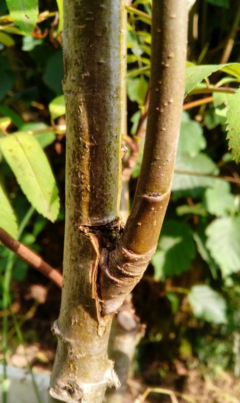 Erste Sommerveredelung mit halberholztem Reisern. Hier, Mispel auf Eberesche. Mein zweiter Versuch. Die Reiser stammen von meiner Mispel-auf-Scharlachweißdorn-Veredelung. Sie wachst so gut, bei einem sehr flachen Winkel, dass ich die Triebe lieber gekürzt habe, bevor mir die Veredelung abbricht.