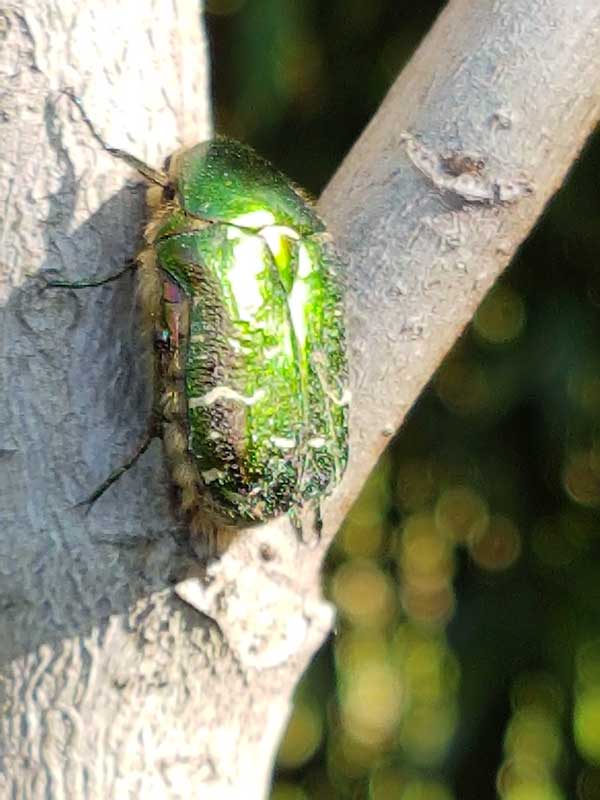 Kupfer-Rosenkäfer oder Goldene Rosenkäfer gibts überall massenhaft, sie sind Pollenräuber und fressen auch weiche Blütenblätter. Sie können Samenanlagen schädigen oder zerstören. In der Landwirtschaft wird er deshalb bekämpft, erst mit Lockstoffen und dann mit Pestiziden.